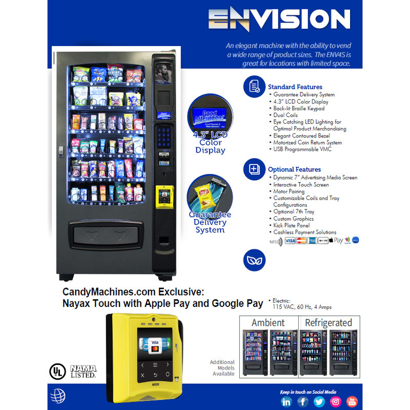 Seaga Envision ENV5S Snack Vending MachineUpdated ADA Compliant ENV5S Infinity Series The Seaga Envision ENV5S Snack Vending Machine holds a total of 547 Snacks. It features a Braille equipped keypad as well as a large, easy-to read 2-line, 20...